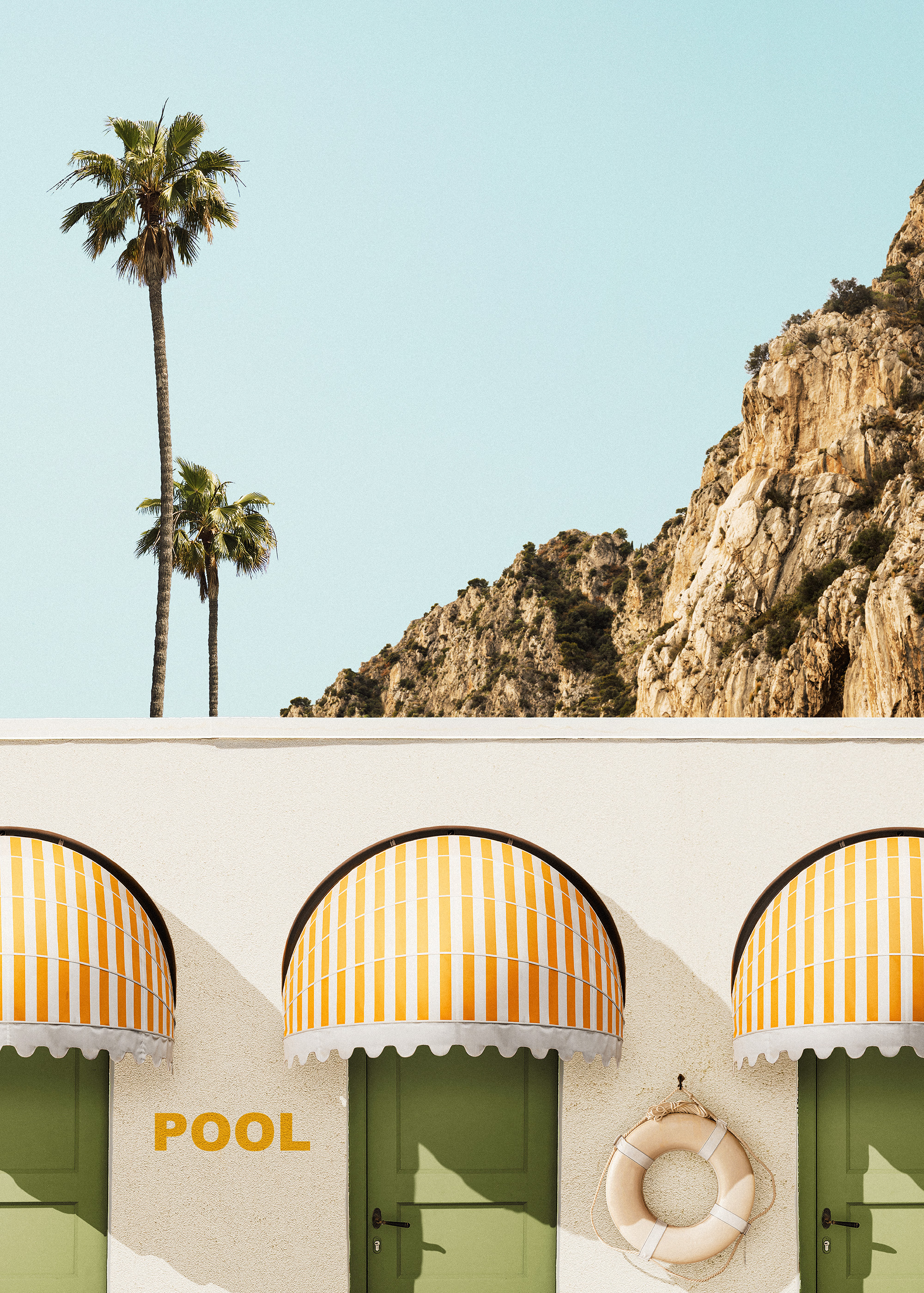 Zostava obrazov s farebnými plagátmi zobrazujúcimi palmu a hory, budovu so zelenými dverami a pruhovanými markízami a plagát zobrazujúci topánky nad bazénom.