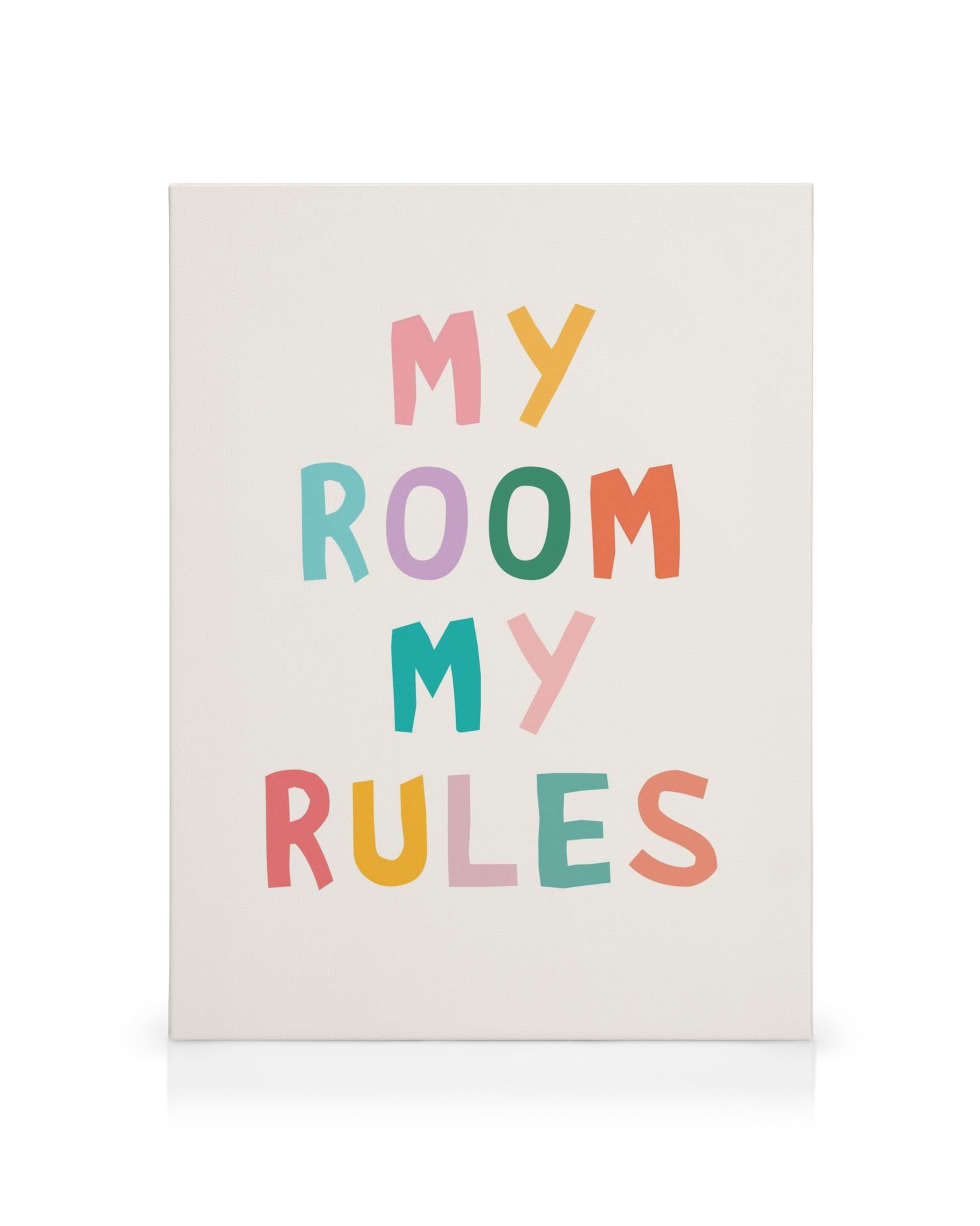 maľba na plátno s farebným citátom "My room my rules" na svetlom pozadí. Tento maľba na plátno je ideálny, keď dieťa podrastie a chce svoj vlastný priestor. Dovoľte deťom, aby nastavili pravidlá pre svoju izbu, nech sa cítia o niečo dospelejšie!