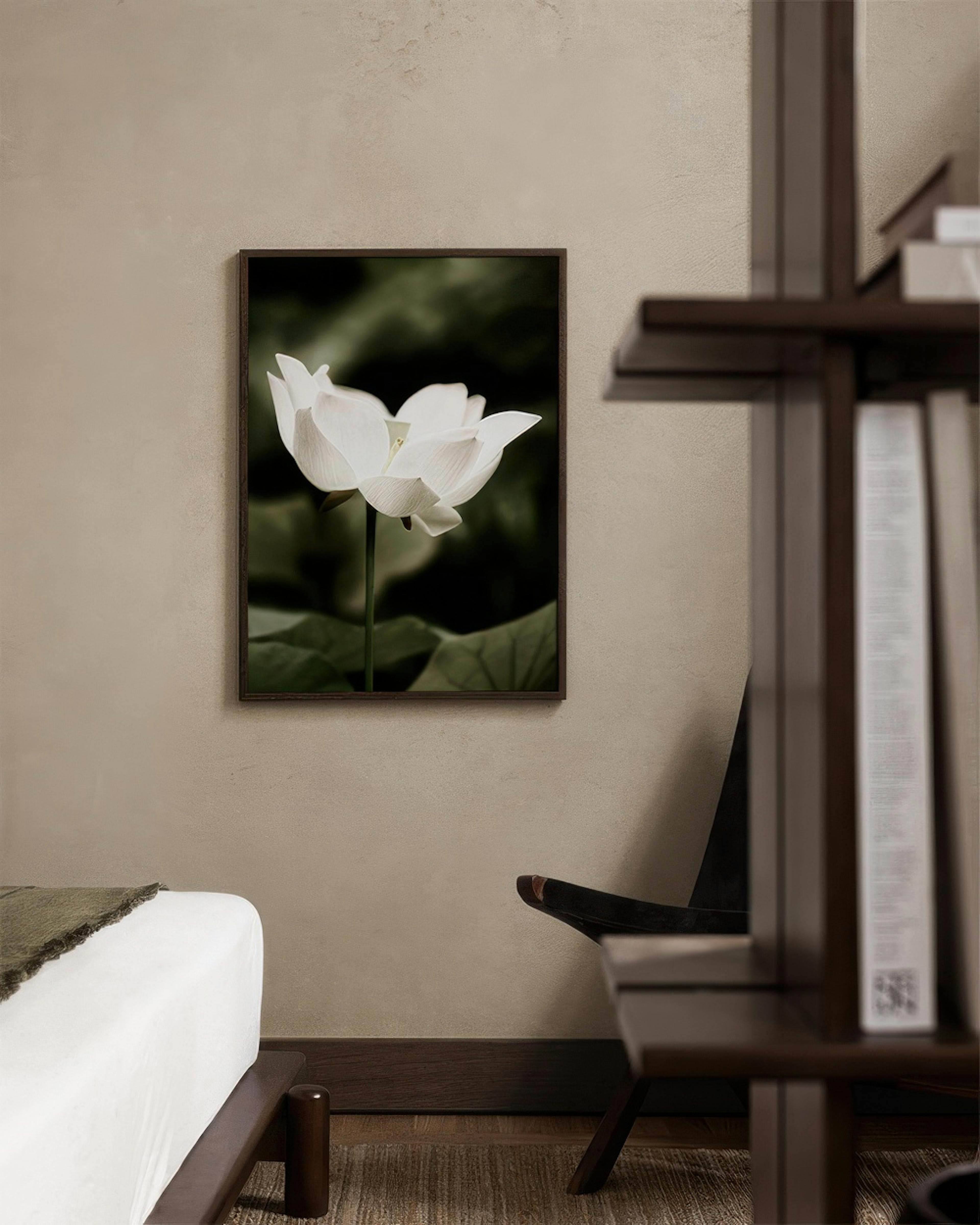 Krásny plagát bieleho kvetu so zelenou stonkou na rozmazanom zelenom pozadí. Jednoduché a elegantné obrazy na stenu pre váš domov!