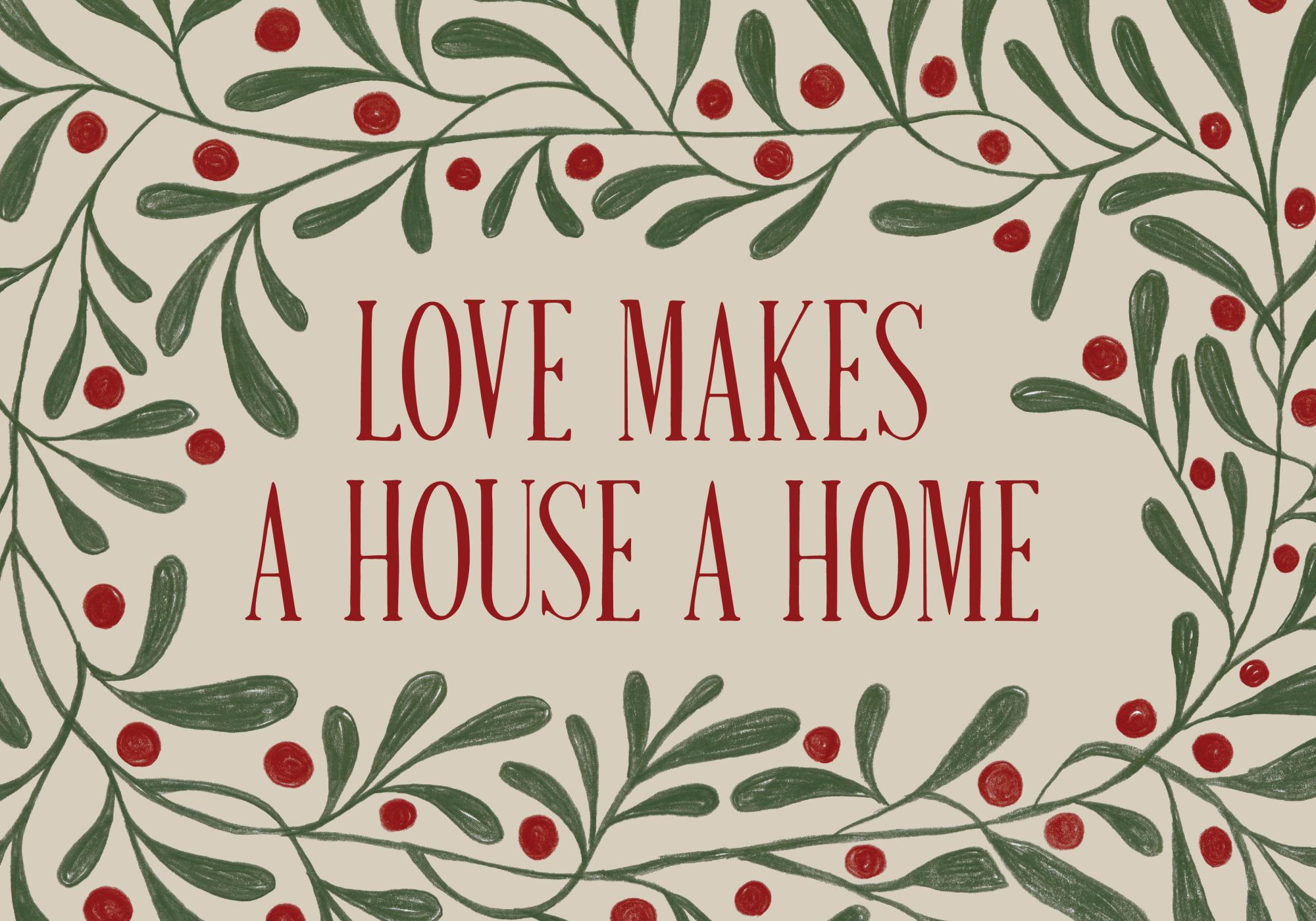 Nástenné umenie s textom "LOVE MAKES A HOUSE A HOME" obklopené zelenými listami a červenými bobuľami. Tento útulný plagát pridá teplo do akejkoľvek izby, ideálny na zostavy obrazov.