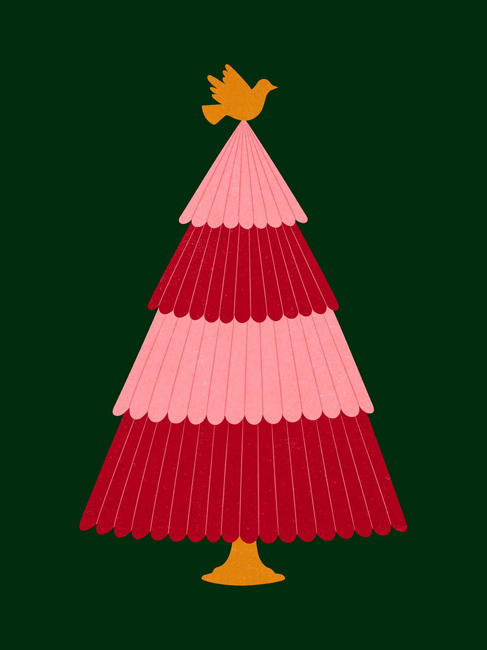 Štylizovaný plagát stromu s vrstvenými ružovými a červenými sekciami v trojuholníkovom tvare. Obsahuje žltého vtáčika na vrchu a tmavo zelené pozadie.