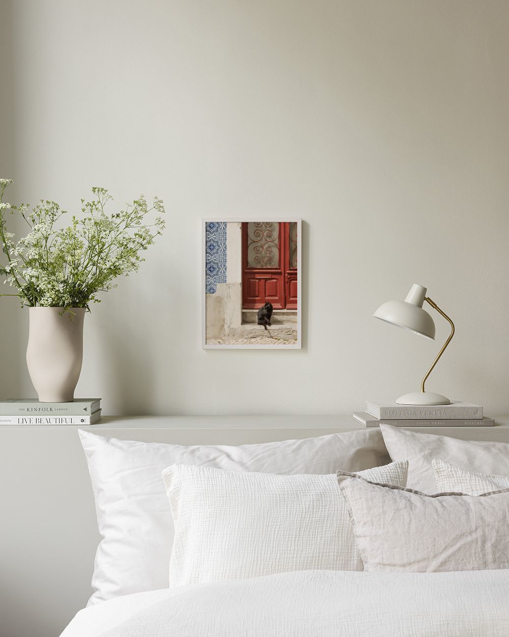 Plagát čiernej mačky sediacej na kamennom schode pred červenými dverami a modrými vzorovanými dlaždicami. Farebný plagát na stenu.