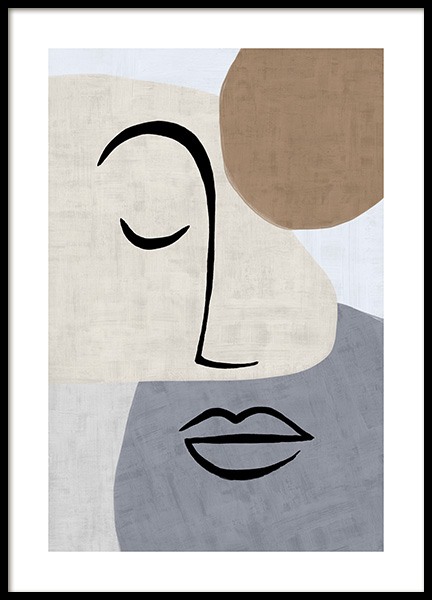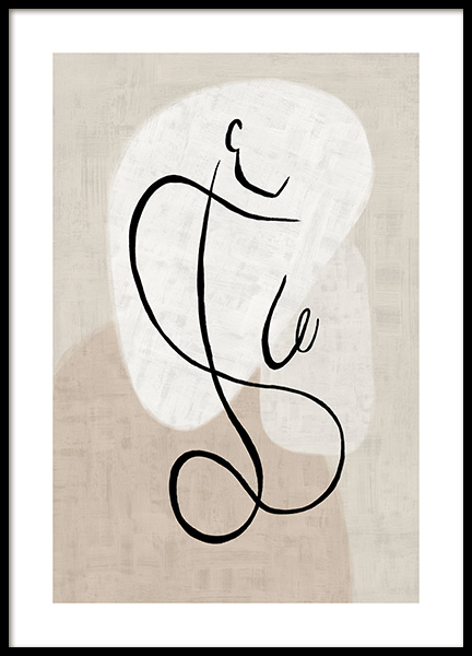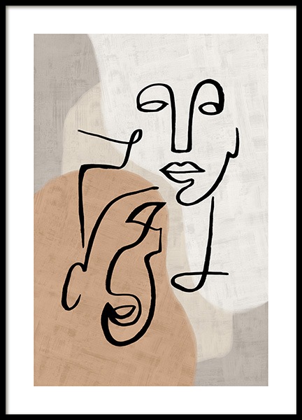 Dizajn z kategórie Handpicked Abstraktná ilustrácia s ciernymi ciarami znázornujúcimi tváre a telo, s béžovými útvarmi a štruktúrovaným pozadím. Tešte sa z umenia a zaveste na steny abstraktné kúsky.