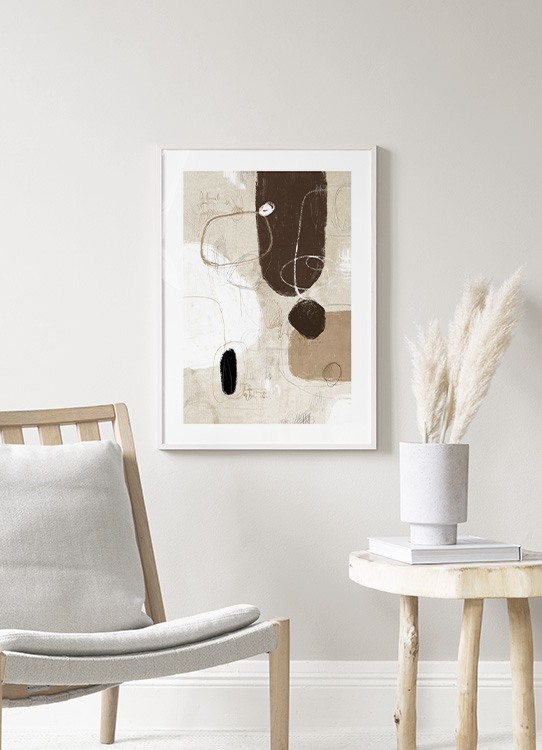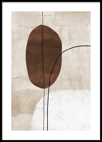 Dizajn z kategórie Handpicked Abstraktná maľba s hnedými, čiernymi a bielymi útvarmi a ťahmi ceruzky na béžovom pozadí. Tento plagát s ladiacou dvojičkou Art Shapes No2 je skvelým ústredným párom do moderného interiéru!