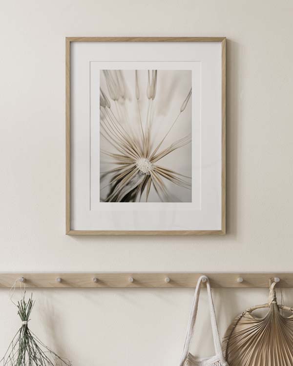 Dizajn z kategórie Handpicked Detailný fotografický záber na béžovú púpavu s rozmazaným pozadím. Vdýchnite interiéru romantický nádych a útulnú, hrejivú atmosféru pomocou botanického štýlu, ktorý je vhodný do spální aj obývačiek.