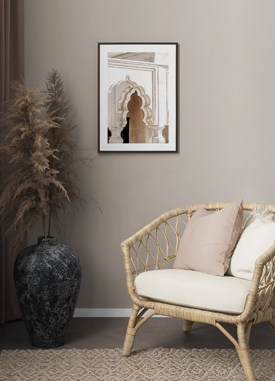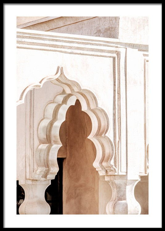 Fotografia béžovej budovy s oblúkovou klenbou. Marrákeš je známy svojou krásnou starodávnou architektúrou v jasných farbách so zlatými detailmi a táto zbierka skutočne zachytáva krásu mesta. Plagát je súčasťou kolekcie Studio Amara z dielne Desenio Design Studio v Marrákeši.