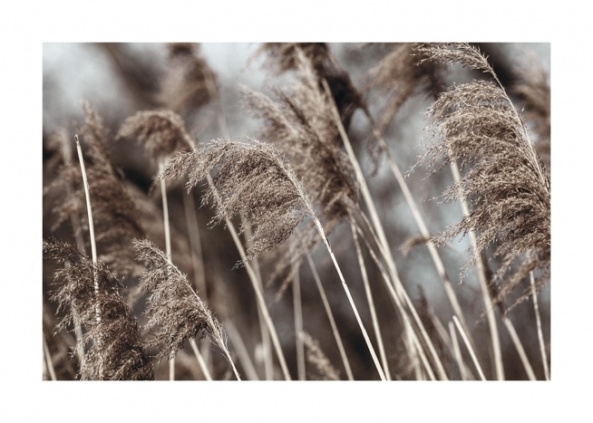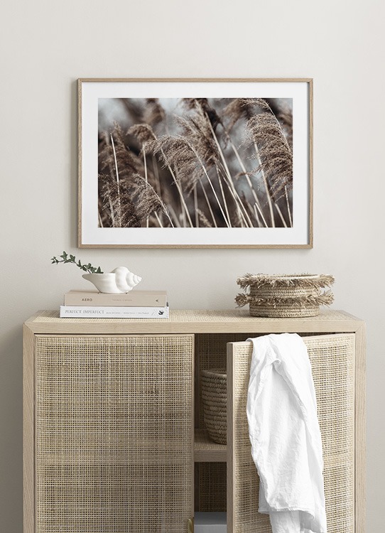 Dizajn z kategórie Handpicked Fotografia béžovej sušenej trávy s rozmazaným pozadím. Sušená tráva je stále rovnako populárna a ak ju máte aj vo váze na konferenčnom stolíku, môžete ju skombinovať s ladiacimi plagátmi.