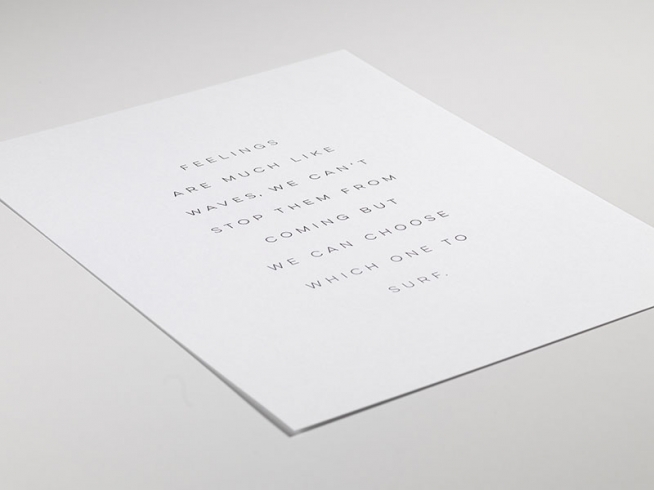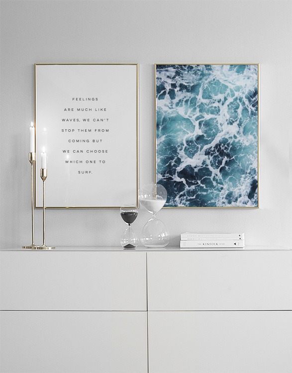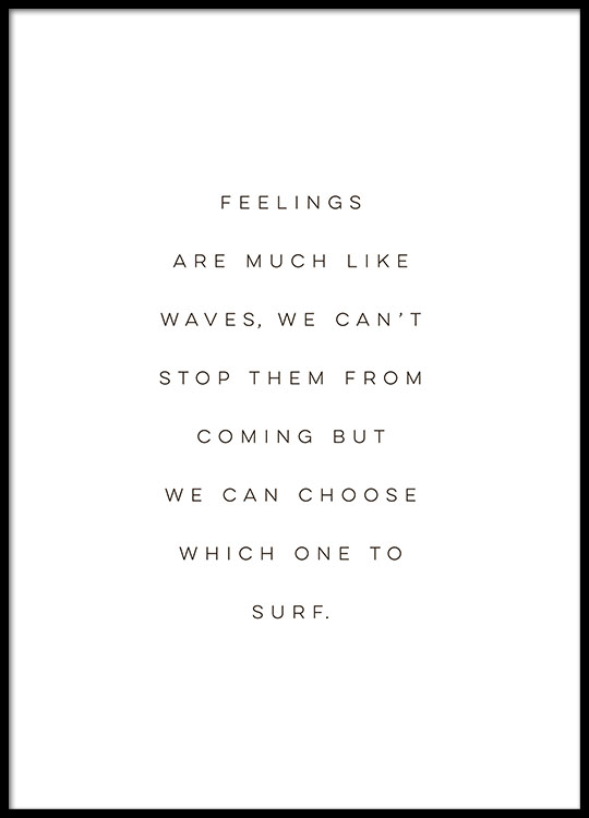 Dizajn z kategórie Handpicked Postery a obrazy s krásnymi citátmi o živote. Pekný obraz s citátom „Feelings are much like waves, we can't stop them from coming but we can choose which one to surf.“ Motivačný poster v duchu krásneho minimalistického dizajnu, ktorý vyzerá výborne v elegantnom interiéri. Krásny na obrazovej stene.