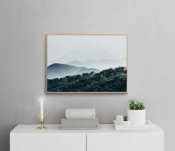 Plansch med naturfoto. Tavla med fotografi på skog och berg.