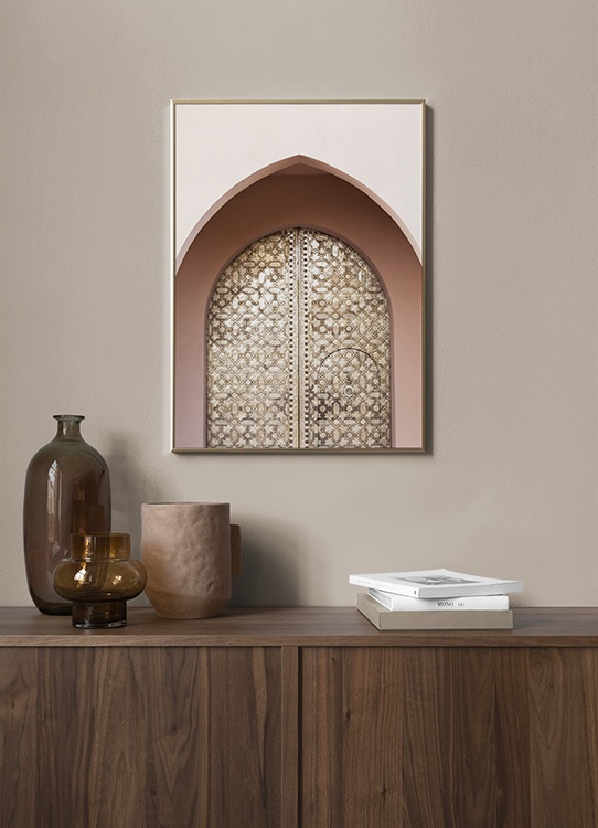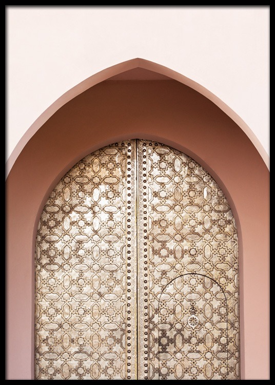 Dizajn z kategórie Handpicked Fotografia zlatých oválnych dverí a ružového oblúka pred nimi. Na Marrákeši nás fascinujú jemné odtiene a detailná ručná prepracovaná architektúra. Tento plagát je súčasťou kolekcie Studio Amara z dielne Desenio Design Studio a vznikol v Marrákeši.