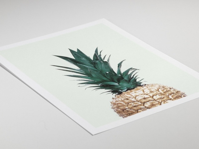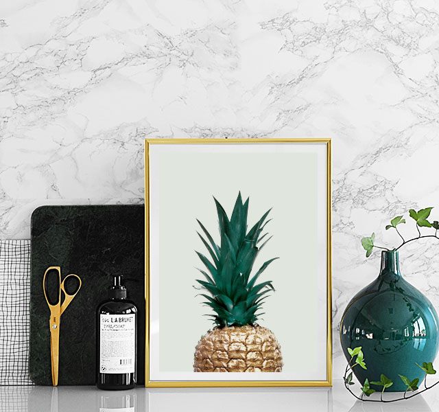 Dizajn z kategórie Handpicked Plagát zlatého ananásu na svetlozelenom pozadí. Štýlový a trendy. Hodí sa do mnohých štýlov dekorácie. Plagát má vsadenú paspartu, ktorá obraz elegantne lemuje.