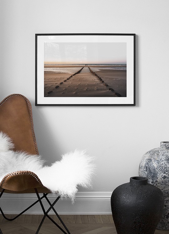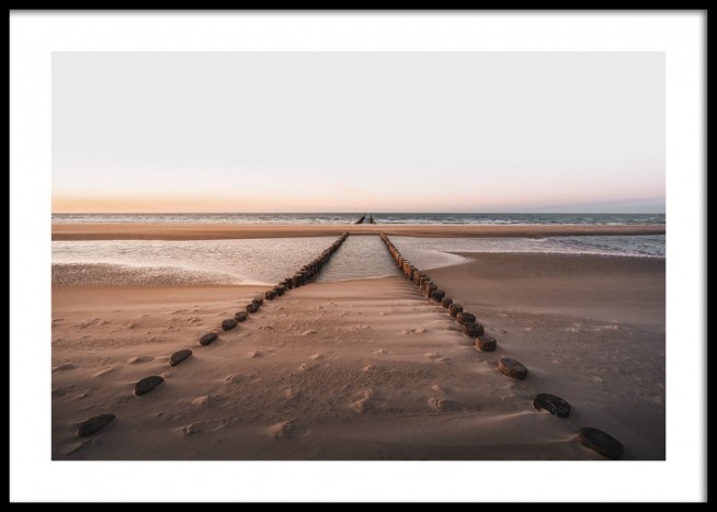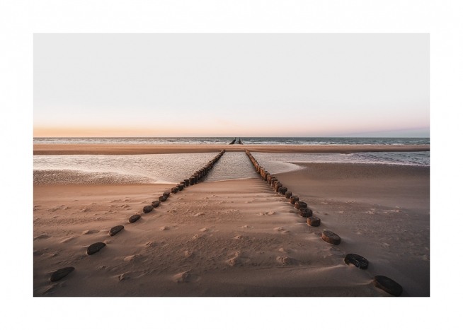 Dizajn z kategórie Handpicked Fotografia pláže pri západe slnka s drevenými stĺpikmi v piesku vedúcimi do oceánu. Prineste relaxačnú náladu do svojho každodenného života mierumilovnými, upokojujúcimi plagátmi prírody! Umiestnite tieto krásne motívy do interiéru a vytvorte pokojný obytný priestor.