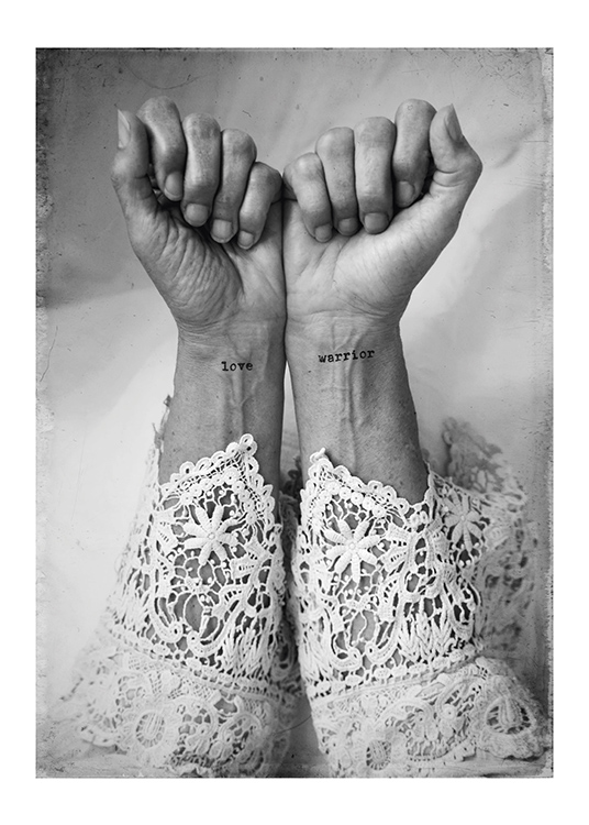 Dizajn z kategórie Handpicked Print „Dogma“ od Love Warriors predstavuje čiernobiely fotoposter dvoch rúk s nápisom „Love Warrior“ na zápästiach. Tvorcovia Love Warriors cestujú po celom svete a hľadajú pekné, iné a unikátne motívy, ktoré by mohli ponúknuť trhu. My v Desenio vám ponúkame vybraný sortiment umeleckých fotografií od Love Warrios. „Dogma“ je inšpirovaná známym citátom novinára Huntera S. Thompsona o tom, že treba stáť vzpriamene a nikdy nezabúdať na ľudí, ktorí nám pripravili cestu - hľadali pravdu a stáli si za láskou. Plagát má „vstavanú“ paspartu, ktorá pekne rámuje motív.