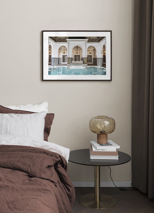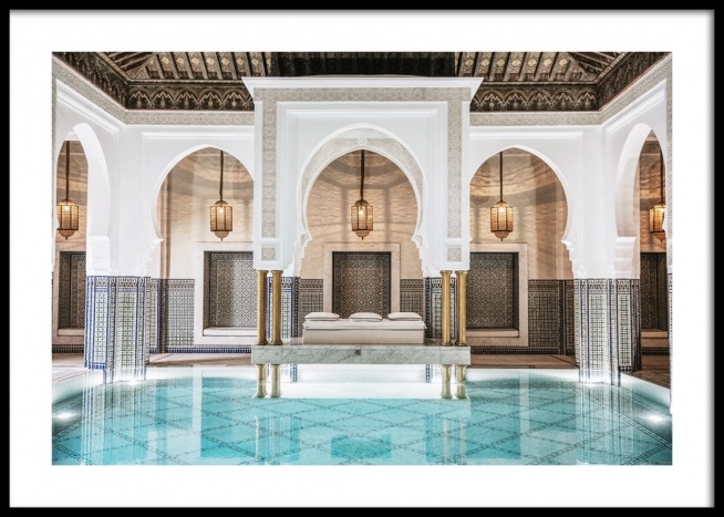 Dizajn z kategórie Handpicked Fotografia bazéna so zlatými lampami, modrými stĺpmi a bielymi zaoblenými klenbami. Toto tajné miesto má veľkú tradíciu aj štýl, a preto sa doň zakaždým zamilujeme. Plagát je súčasťou kolekcie Studio Amara z dielne Desenio Design Studio a vznikol v Marrákeši.