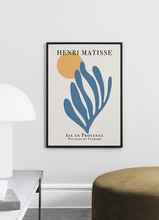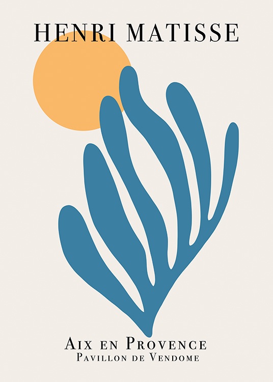 Dizajn z kategórie Handpicked Grafická ilustrácia s modrým koralom a oranžovým kruhom na špinavobiely pozadí s nápisom „Henri Matisse“ navrchu. Ak vás fascinuje a inšpiruje práca Matisseho rovnako ako nás, tento plagát je skvelá voľba! Ďalšie ladiace kúsky nájdete v kategórii plagátov inšpirovaných Matissem.