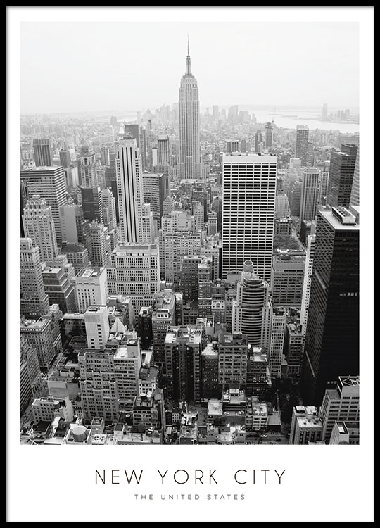 Dizajn z kategórie Handpicked Čiernobiela fotografia mrakodrapov v New Yorku s nápisom „New York City The United States“. Tento plagát v retro štýle sa hodí do rôznorodých interiérov a rôznych izieb a je ideálny, ak chcete niečím doplniť škandinávsky dizajn.