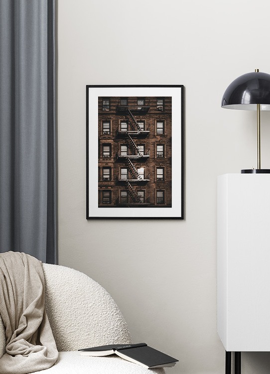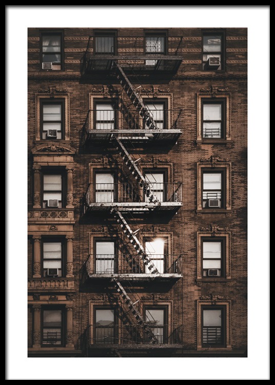 Dizajn z kategórie Handpicked Fotografia okien a požiarneho schodiska na vonkajšej strane hnedej budovy. Ak nemôžete zájsť do New Yorku, prineste si ho domov! S plagátmi New Yorku pocítite pulz mesta vo vlastnom interiéri.