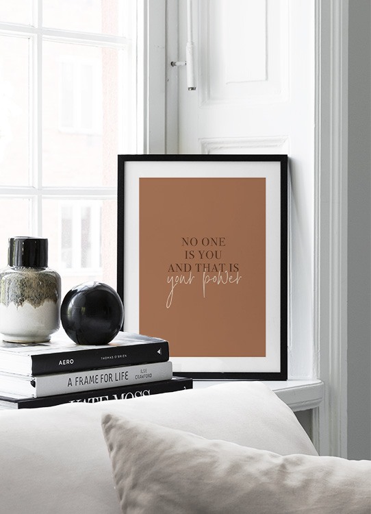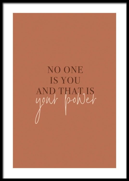 Dizajn z kategórie Handpicked Plagát s čierno-béžovým nápisom „No one is you and that is your power“ na tehlovočervenom pozadí. Naplňte interiér obľúbenými citátmi a pripomeňte si, že ste jedinečný!