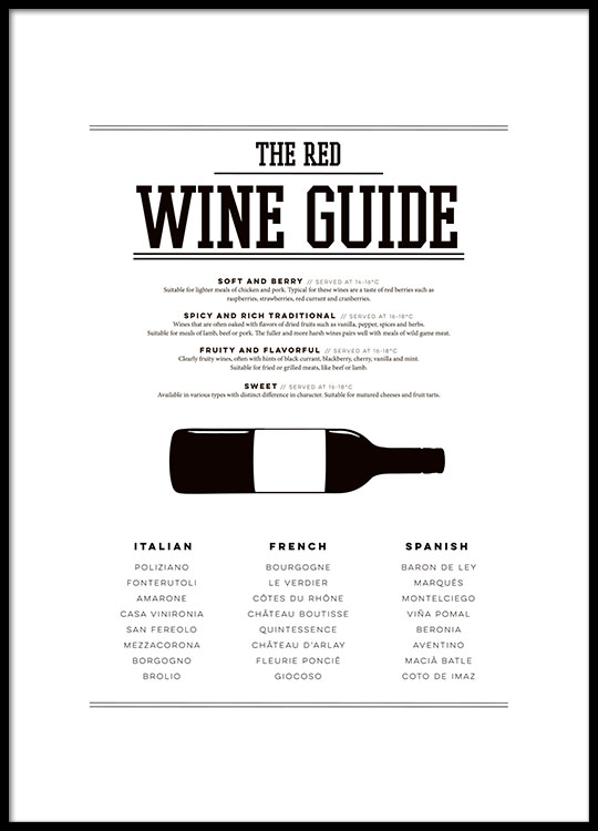 Od 9,10 €Čiernobiely plagát so sprievodcom červenými vínami. Štýlový obraz, dokonalý do kuchyne a skvele ladí s našimi ďalšími plagátmi s kuchynskými motívmi, napríklad s plagátmi častí hovädzieho a jahňacieho mäsa! Potrebujete nápady na nástennú dekoráciu? Pozrite si naše inšpiračné miestnosti! Plagát je vytlačený na nenatieranom matnom bielom papieri vysokej kvality.