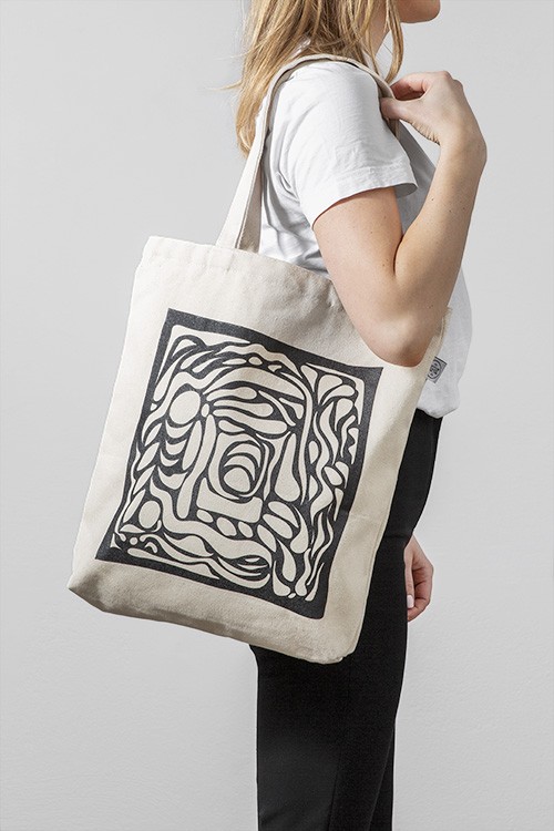 – Béžová bavlnená taška s abstraktnou čiernou ilustráciou na prednej strane