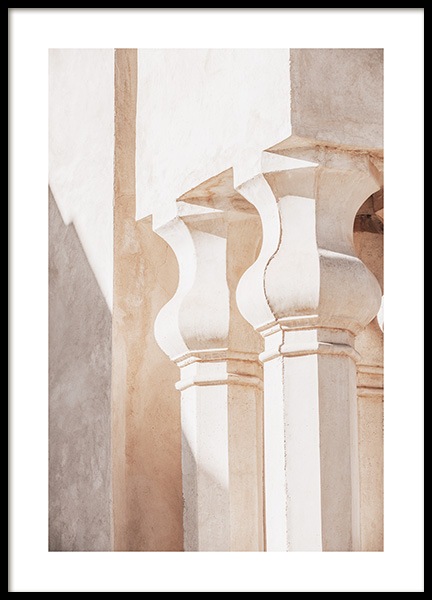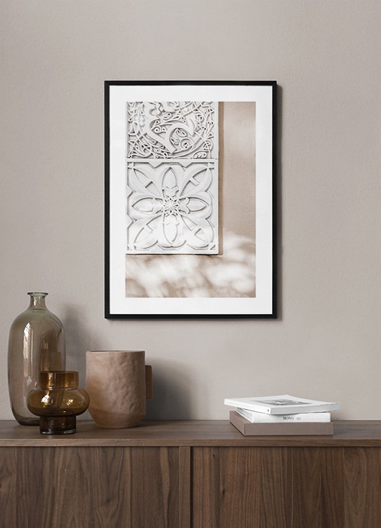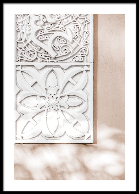 Dizajn z kategórie Handpicked Detailný záber na biele dlaždice s vyrezávanými motívmi na bledoružovej stene. Ľudské dedičstvo Marrákešu vytvárané so zmyslom pre detail je skutočne unikátne. Plagát je súčasťou kolekcie Studio Amara z dielne Desenio Design Studio a vznikol v Marrákeši.