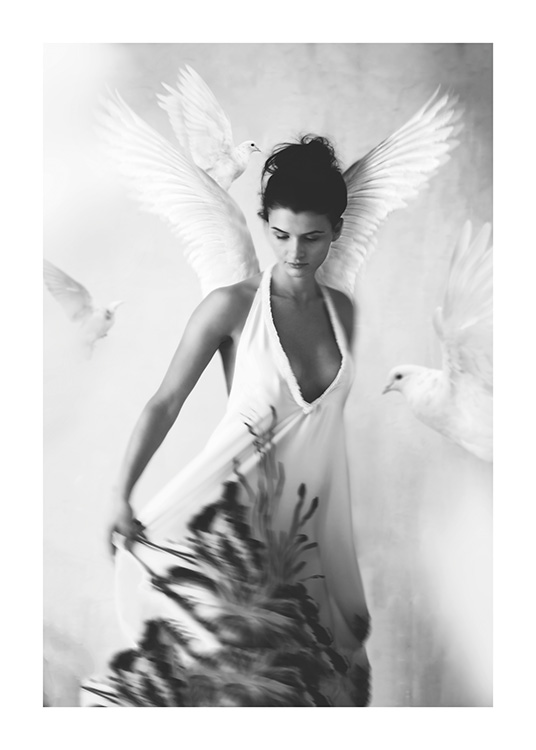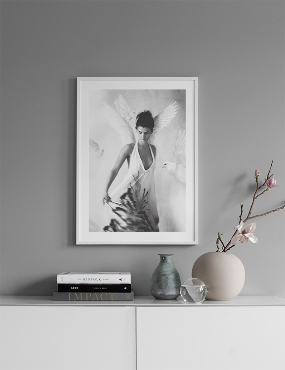 Dizajn z kategórie Handpicked Plagát Halo od Tove Frank z jej série Essence je jedným z našich starostlivo vybraných dizajnov. Plagát Halo je krásna čiernobiela fotografia ženy s bielymi anjelskými krídlami. Biele holubice, ktoré okolo ženy poletujú, pôsobia pocitom pokoja a lásky a dokonale zachytávajú atmosféru, ktorá sa stala synonymom umeleckých diel od Tove. Plagát Halo od Tove Frank má „vsadenú“ paspartu, ktorá obraz elegantne lemuje.