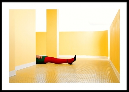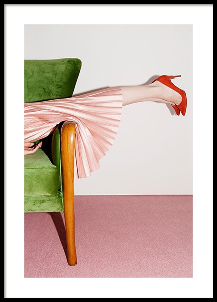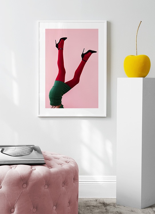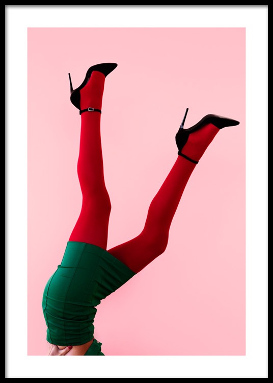 Dizajn z kategórie Handpicked Fotografia eny, ktorá má oblecené cervené pancuchy, zelenú suknu a cierne topánky s vysokými podpätkami a zdanlivo je hore nohami.