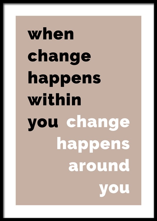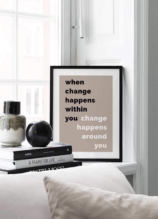 Dizajn z kategórie Handpicked Plagát s čiernobielym citátom „When change happens within you change happens around you“ na béžovom pozadí. Plagáty s citátmi sú perfektné na vytvorenie unikátneho interiéru!