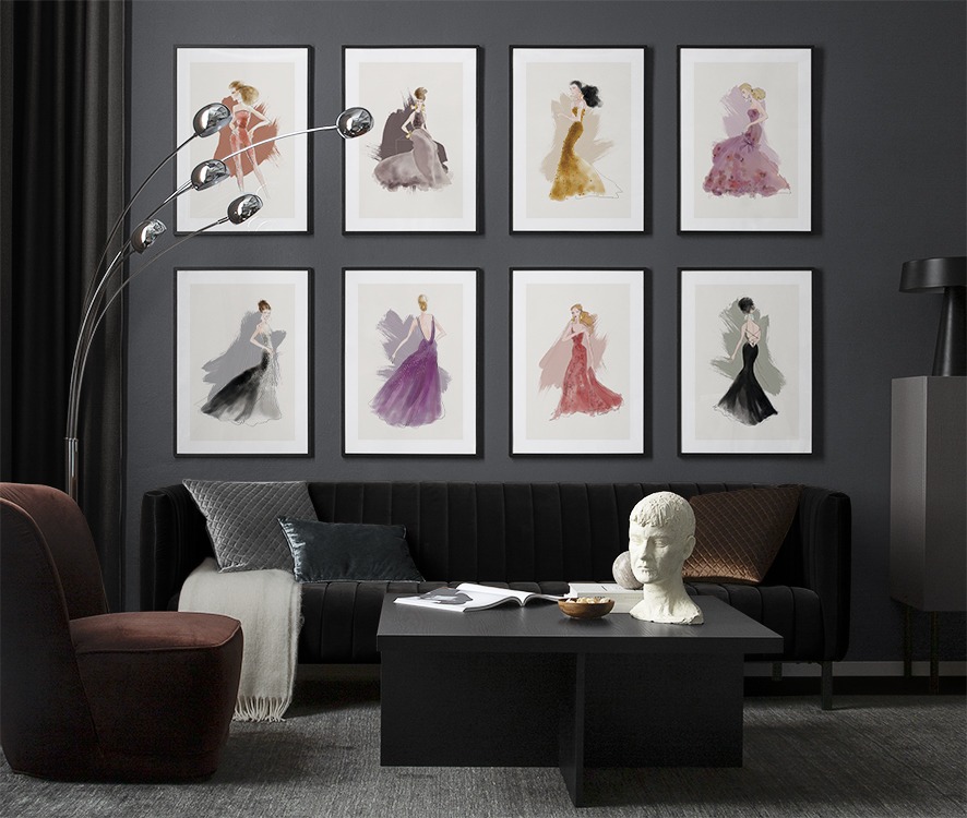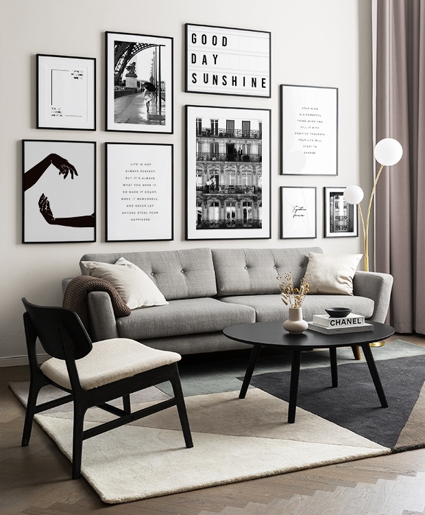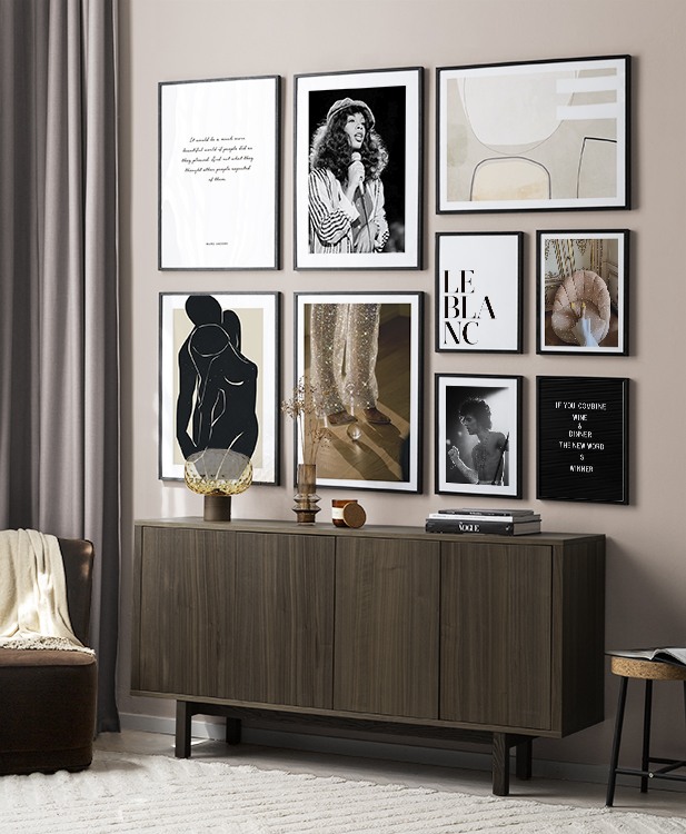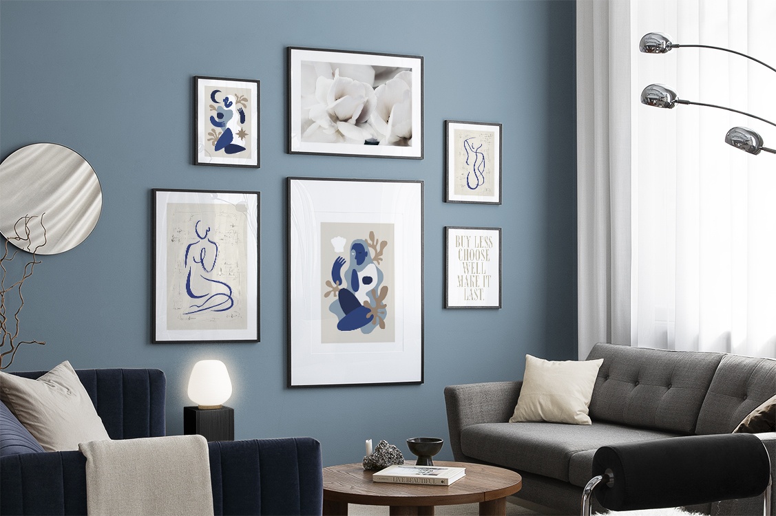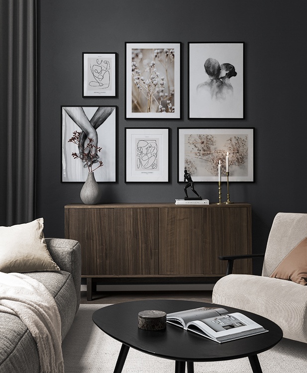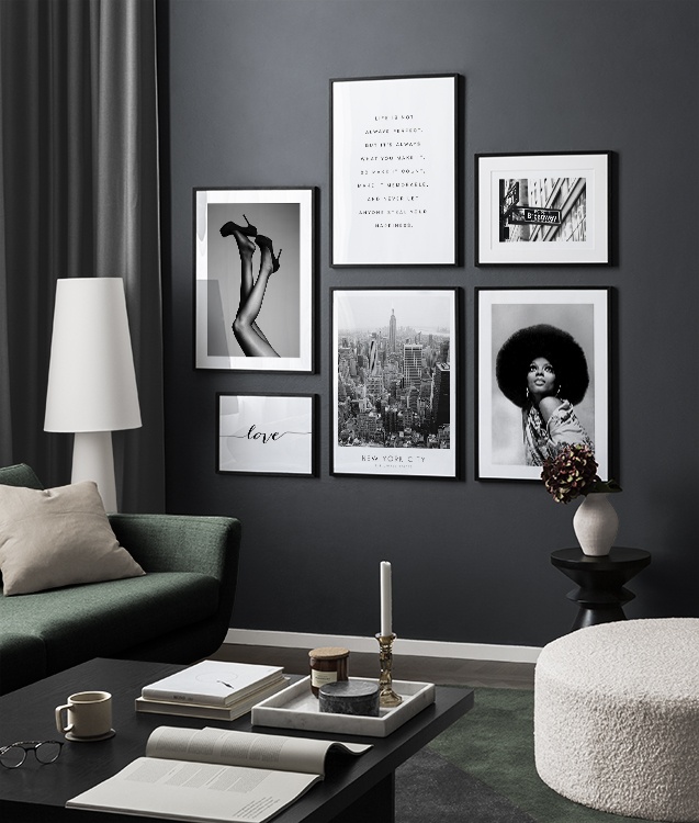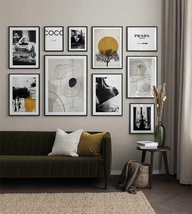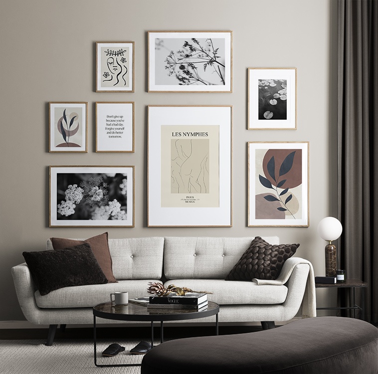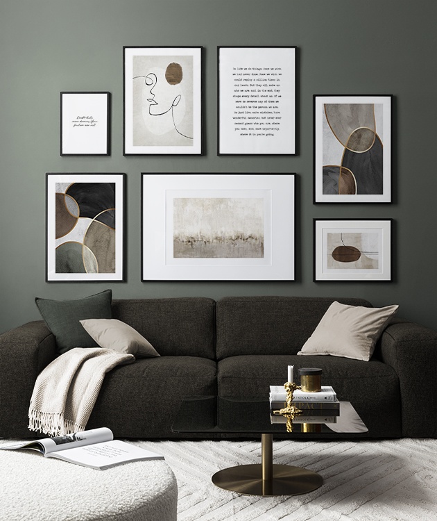 Nájdite inšpiráciu a dekoračné tipy, ako zaplniť veľké steny v obývačke nástenným umením a nástennými doplnkami. Obývačka je zvyčajne najväčšia miestnosť v dome a jej priestranné steny sú ideálne na vytvorenie nápadnej zostavy obrazov. Odporúčame skombinovať plagáty rôznych veľkostí a formátov a vytvoriť tak zostavu obrazov, ktorá pôsobí energicky a odráža vašu osobnosť.